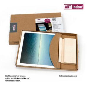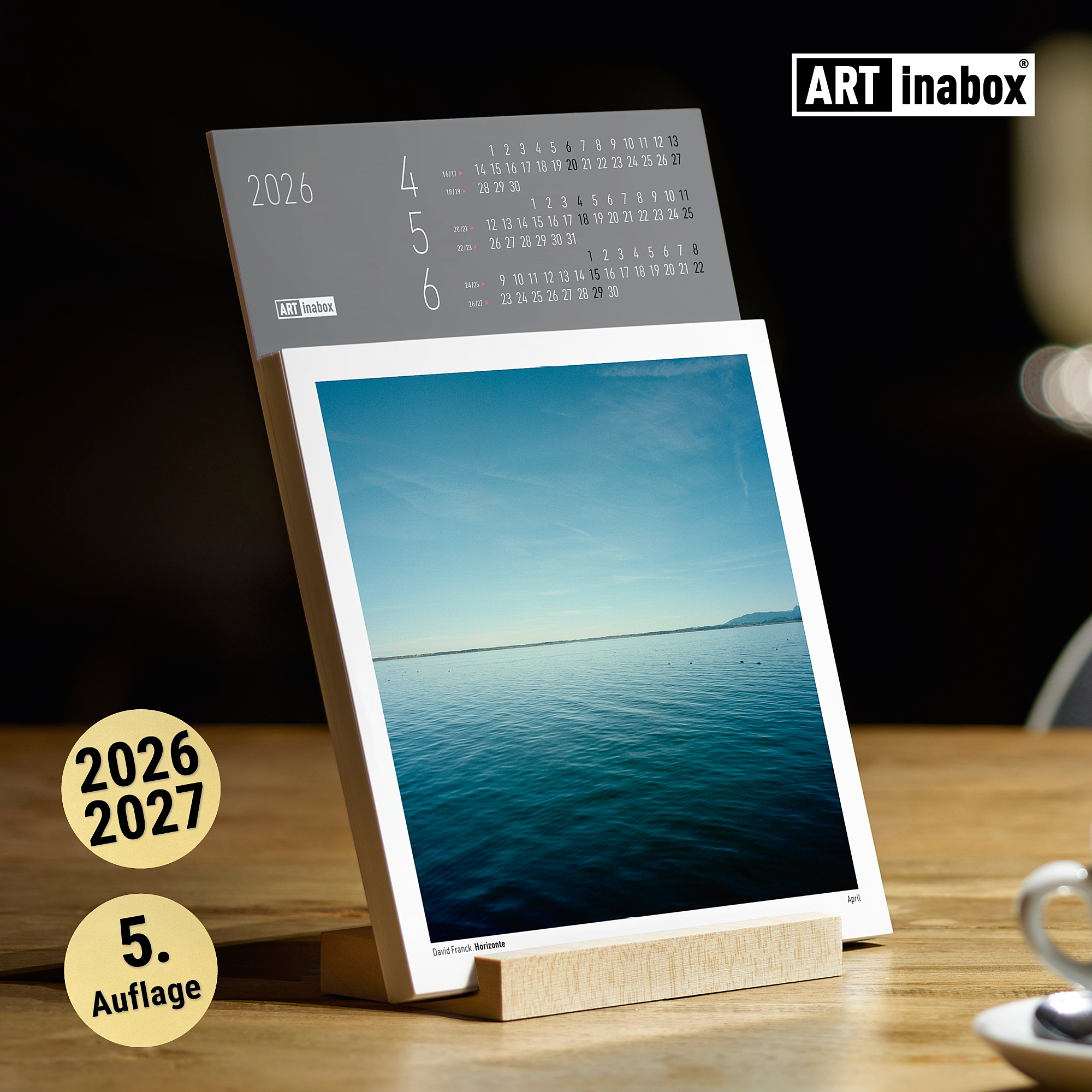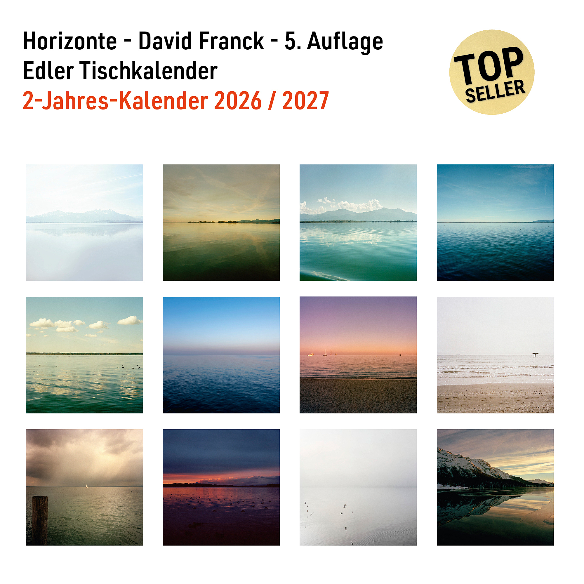 Die Motivserie „Horizonte“ von David Franck entstand im Laufe einiger Jahre als freie Arbeit bei Bootsfahrten, Spaziergängen am Meer oder an Seen. Das Quadrat und der stets mittige Horizont sind dabei die zentralen Gestaltungsmittel. Es handelt sich dabei nicht um quadratische Ausschnitte der Aufnahmen, sondern die Motive wurden direkt im vollen Bildformat der analogen Mittelformatkameras von Rolleiflex und Hasselblad auf 6 x 6 cm Farbnegativmaterial fotografiert. Durch die spiegelverkehrte Ansicht im Lichtschachtsucher, die manuelle Scharfstellung auf der Mattscheibe und die Belichtungs- steuerung mit Handbelichtungsmesser, führt die Technik der Kameras aus den 1950er bis 1970er-Jahren zu einer langsamen Arbeitsweise. Dies wird in den reduzierten Kalendermotiven sichtbar.